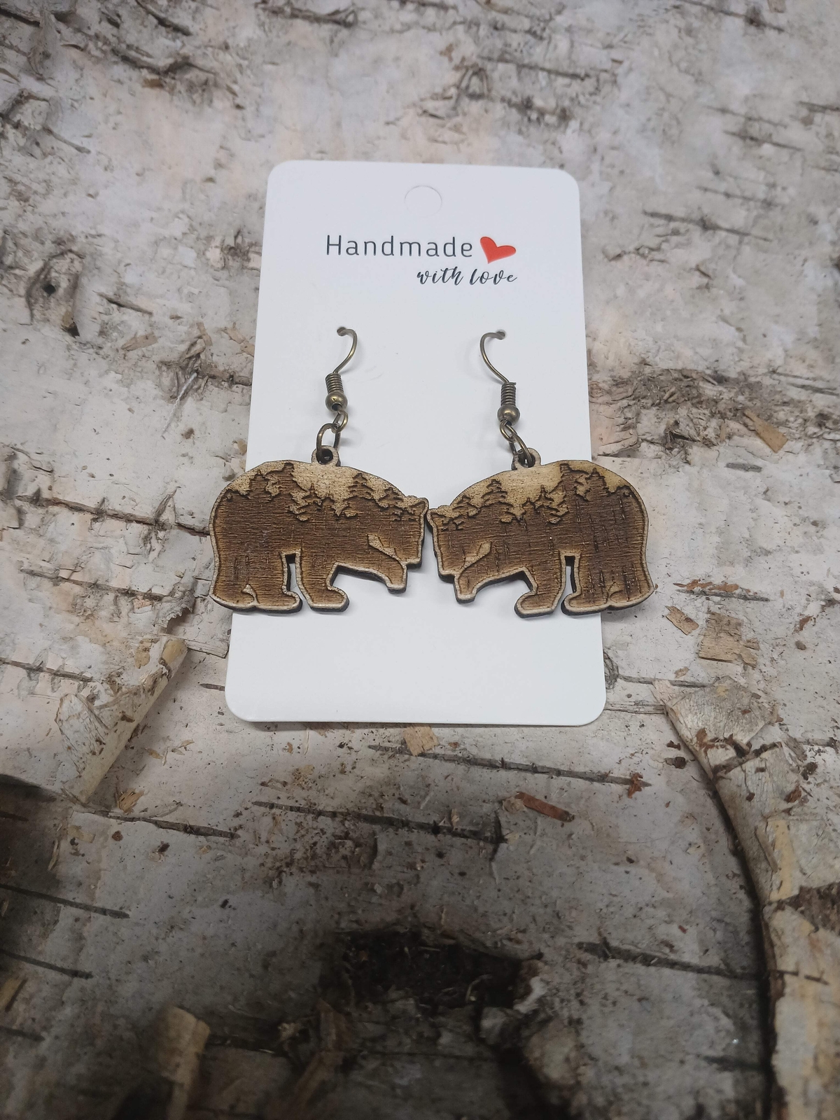 Handmade with Love – Natural Wood Bear Forest Scenic Earrings