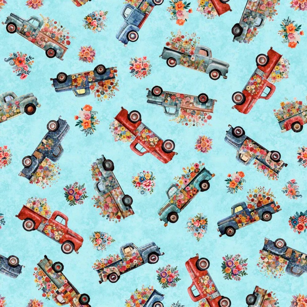 Heartland Truck Toss Aqua Cotton Fabric