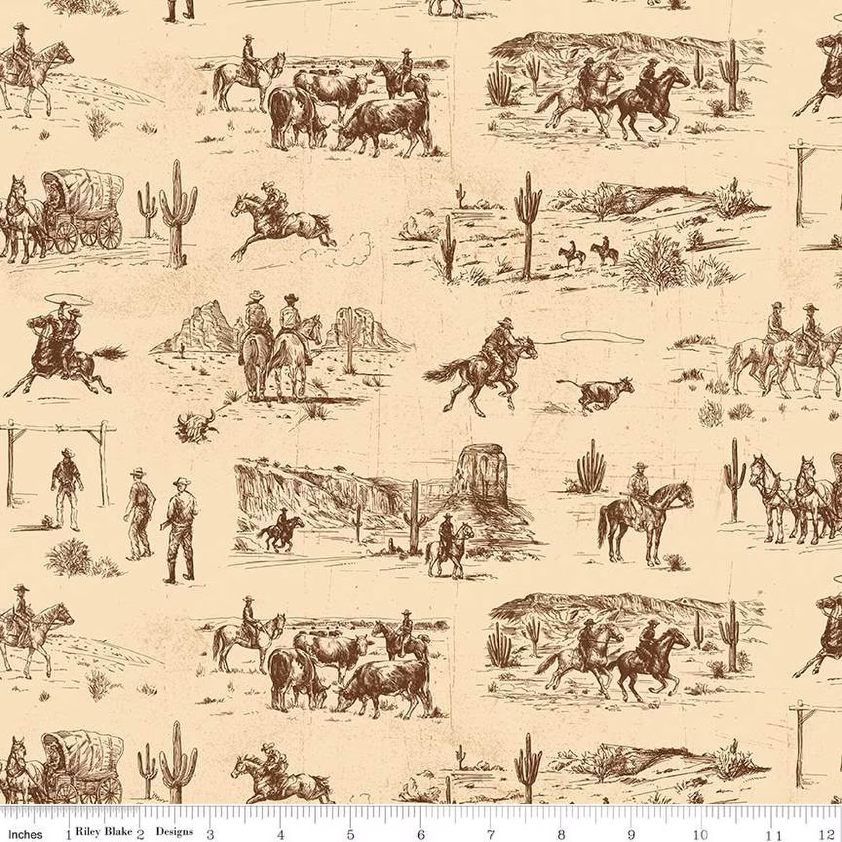 * Item DescriptionThe John Wayne American West collection for Riley Blake Designs is great for quilting, apparel and home decor. This print features tonal western landscape themes with cowboys. Official licensed product.