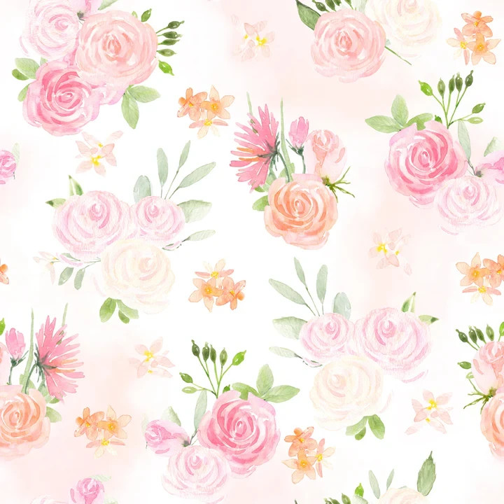 This flannel fabric features a delicate floral design with a watercolor effect, showcasing an array of soft pink, peach, and white roses interspersed with green leaves. The pattern is set against a light, almost white background.