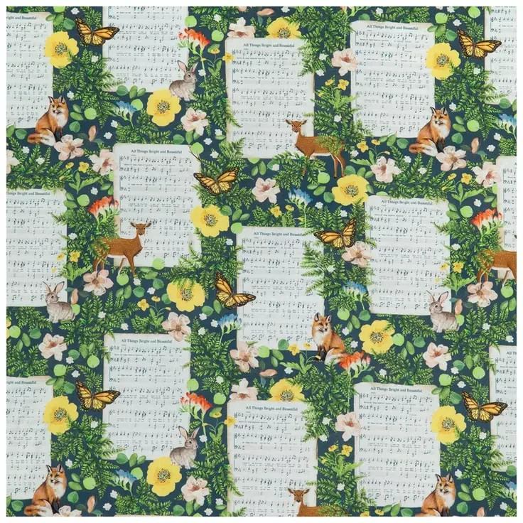 Take your project on an adventure with the help of this Sheet Music & Woodland Animals Cotton Calico Fabric! This soft fabric features a repeated pattern of pieces of sheet music surrounded by green leaves, flowers, butterflies, and woodland creatures. The sheet music features a page of the song “All Things Bright And Beautiful” which complements its gorgeous earthy scene. Create accessories or quilts with this dreamy fabric.