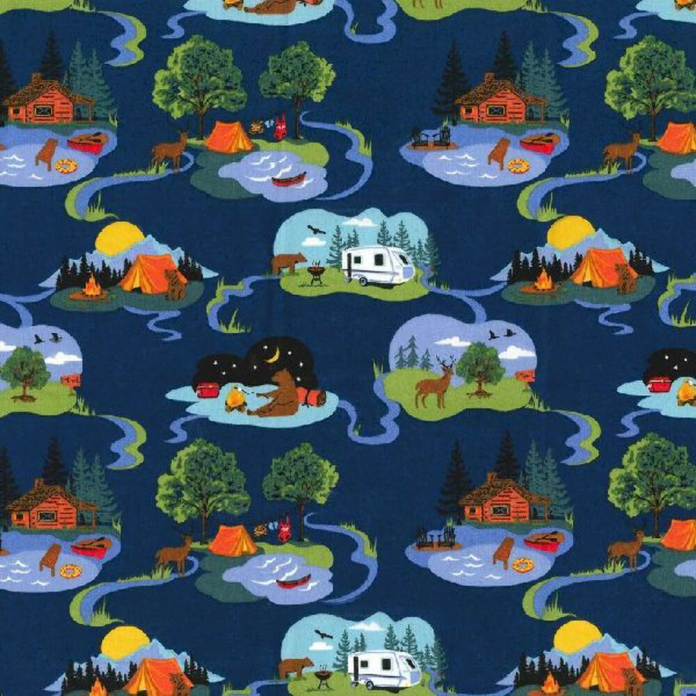 Woodland Camping Cabins Cotton Fabric